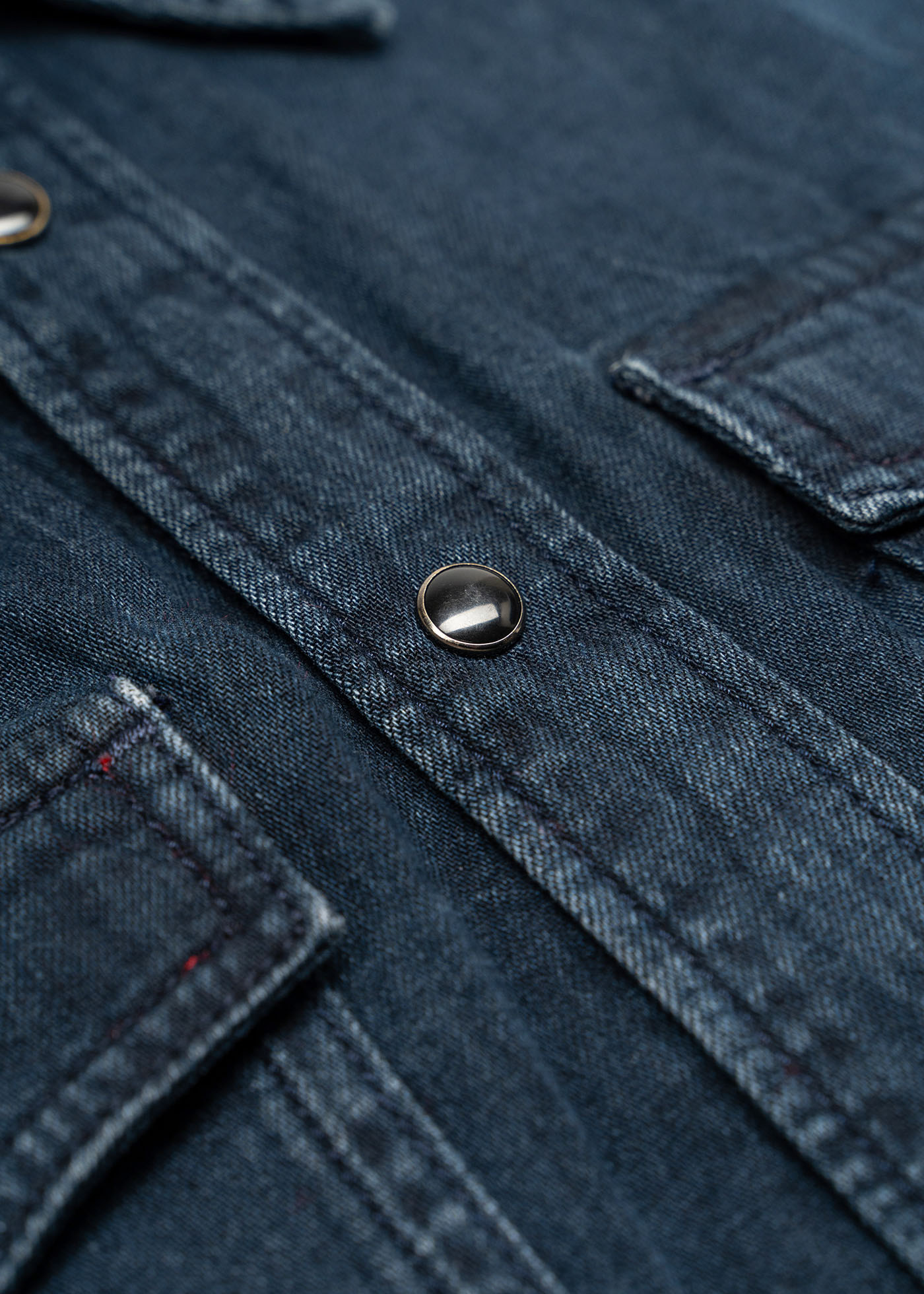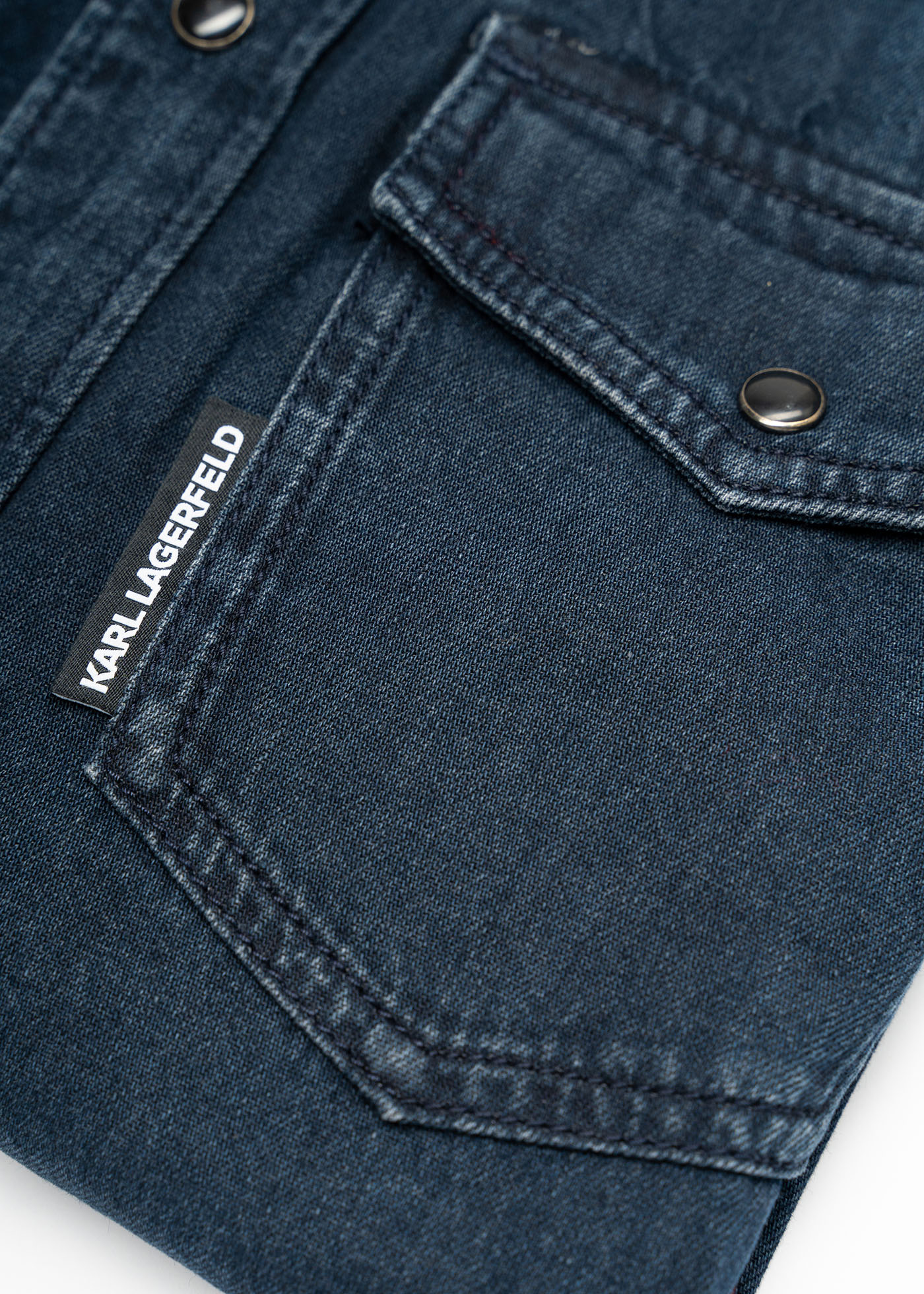 Aνδρικό Denim Πουκάμισο της εταιρείας Karl Lagerfeld. Ανήκει στην Denim συλλογή της εταιρείας και αποτελείται από μαλακό ύφασμα υψηλής ποιότητας. Είναι μονόχρωμο και σε κανονική γραμμή, ενώ το λογότυπο την διακοσμεί στο ύψος του στήθους πάνω στην τσέπη.
