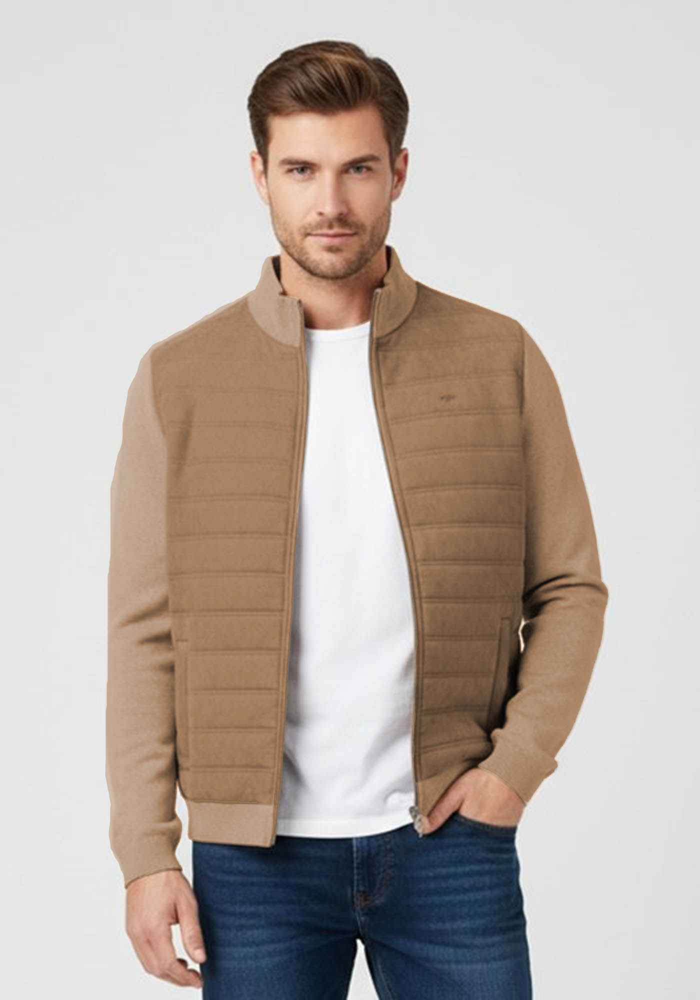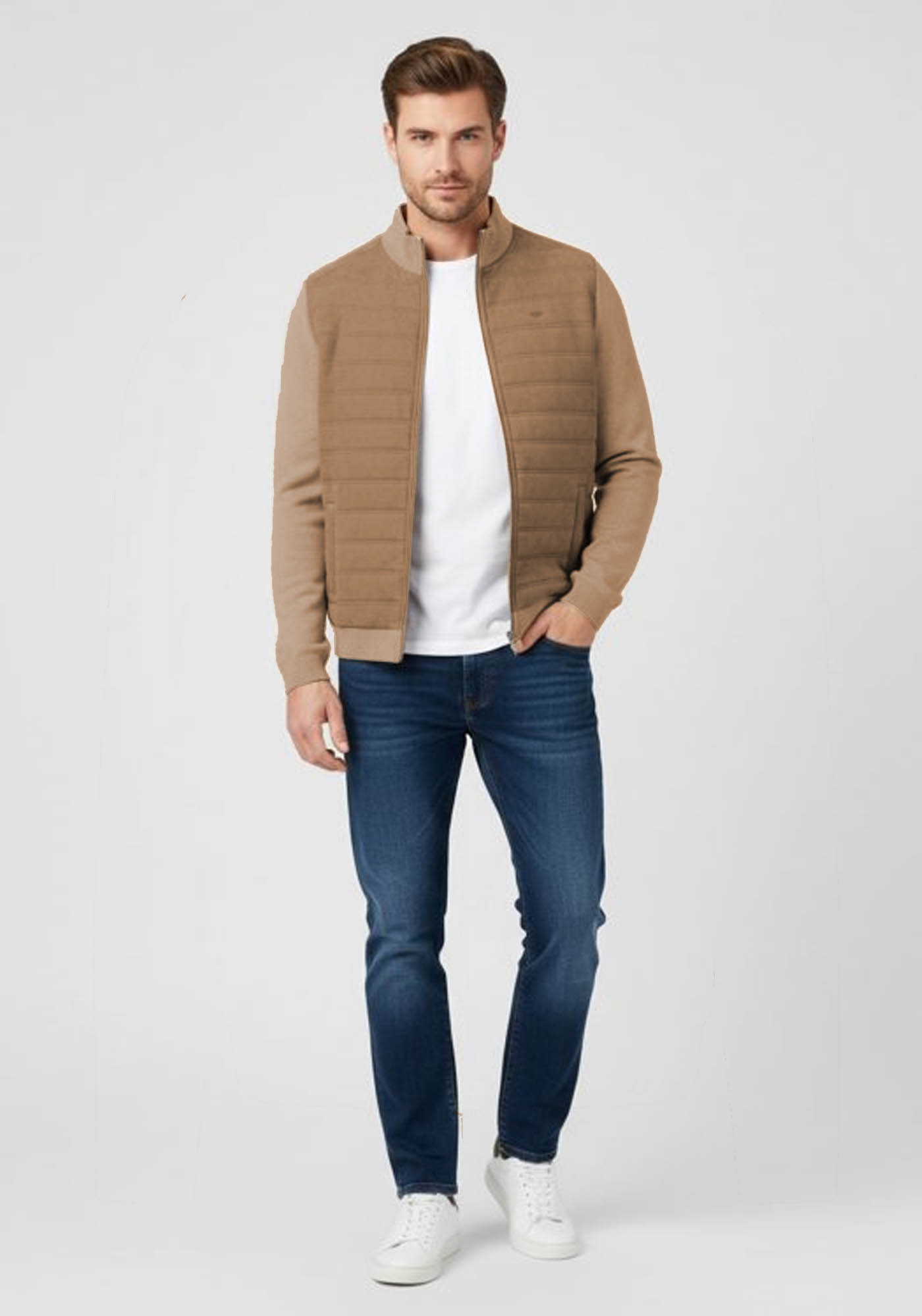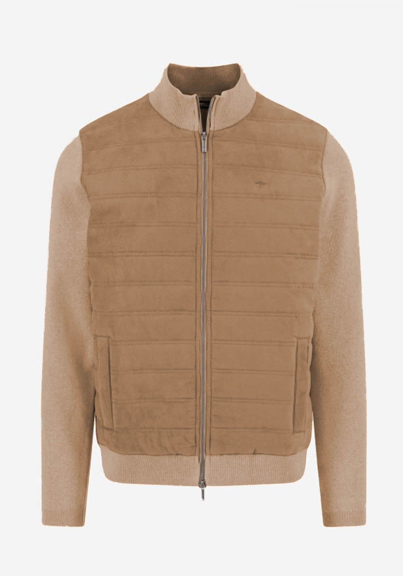 Ανδρική ζακέτα της εταιρείας Fynch Hatton. Aνήκει στην Hybrid συλλογή και είναι σε loose γραμμή, από συνδυασμό υφασμάτων. Κύριο χαρακτηριστικό του η λεπτομέρεια με fake suede στην προστά όψη.Tέλος διαθέτει ribbed γιακά με διακριτική ρίγα που προκαλεί διχρωμία, δύο πλαίνές τσέπες που κλείνουν με φερμουάρ, αλλά και πλέξη λάστιχο σε μανίκια και μέση για σταθερό κράτημα.