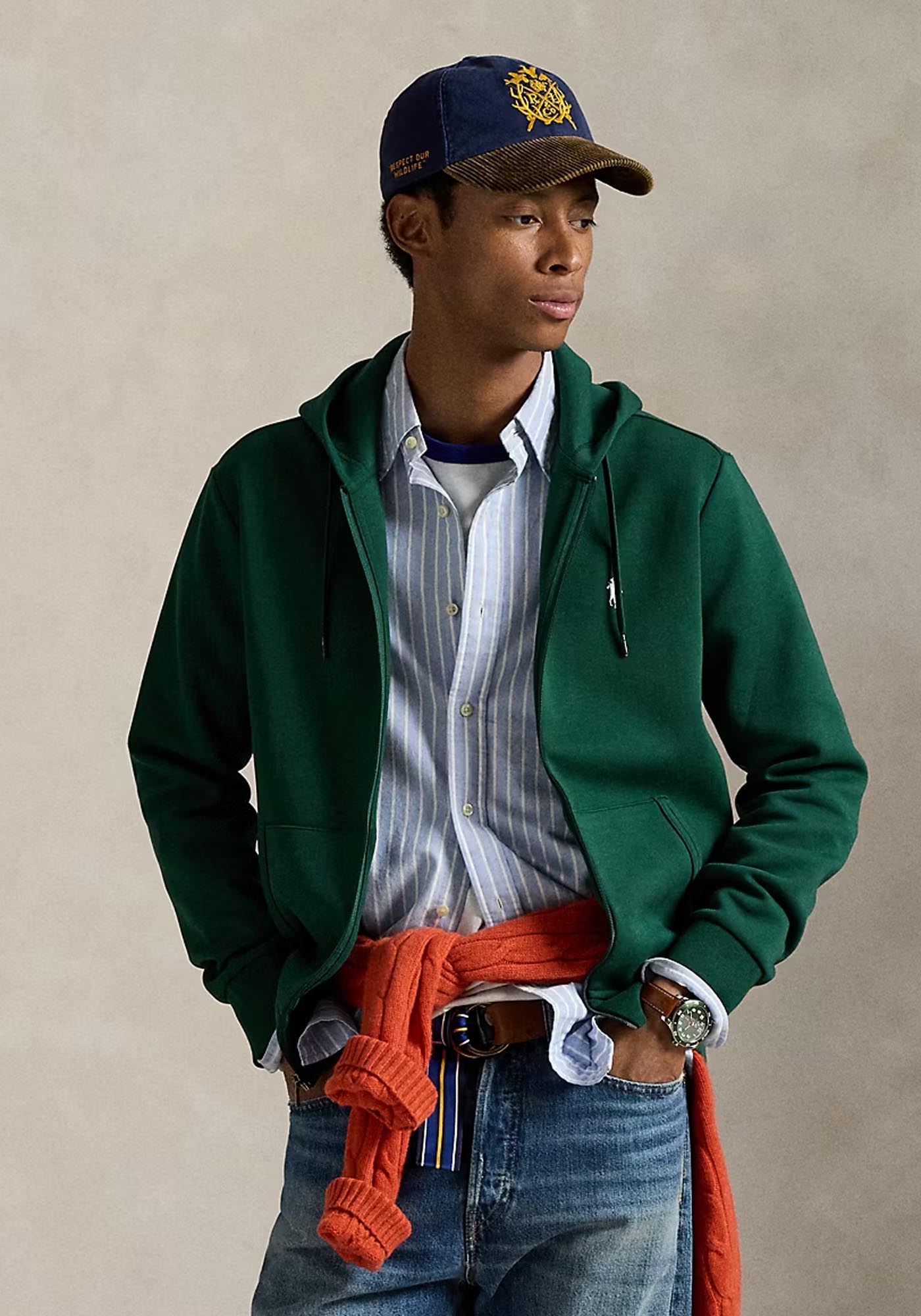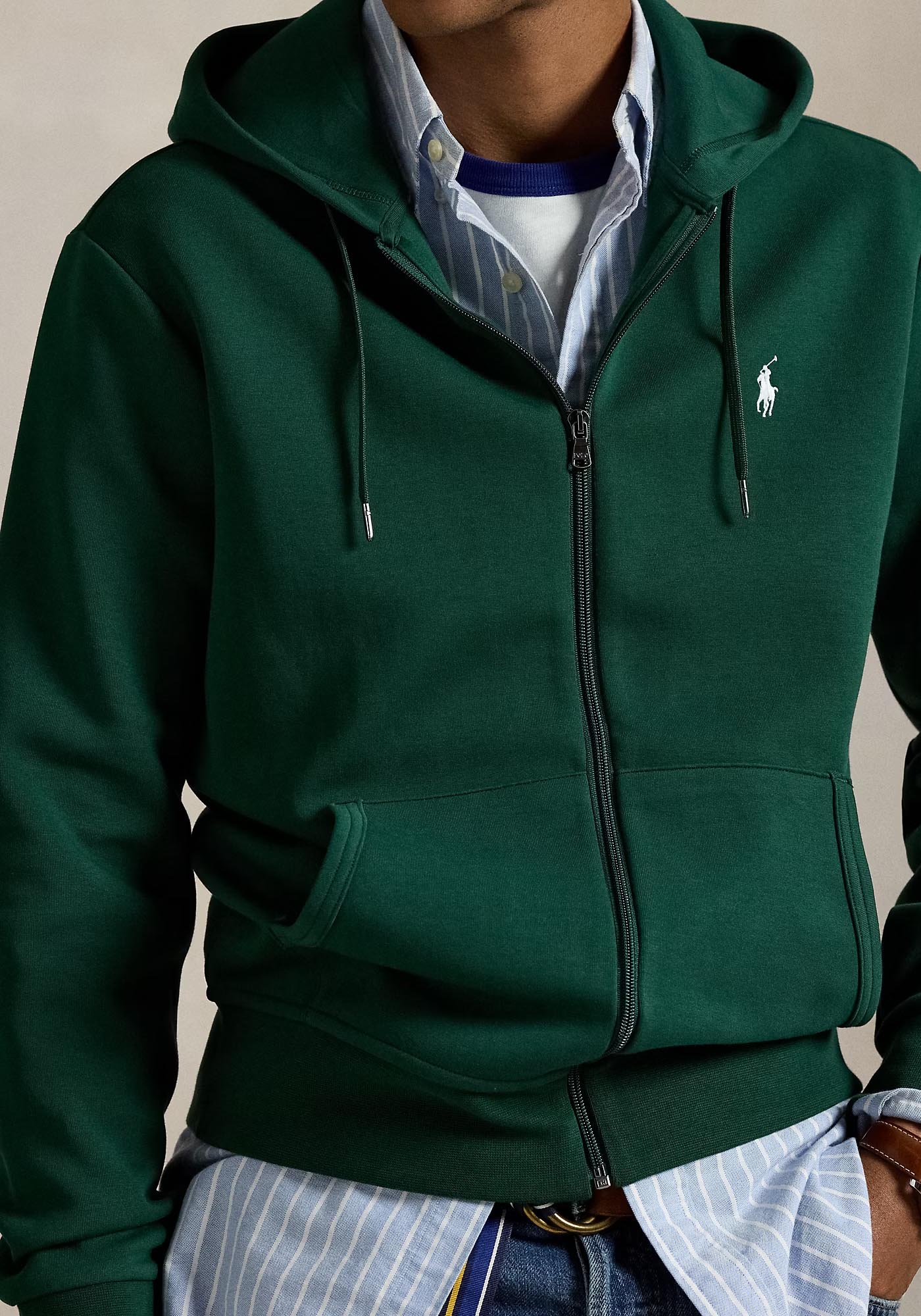Ανδρική ζακέτα από την εταιρεία Polo Ralph Lauren. Ανήκει στην Double-Knit συλλογή της εταιρείας και είναι μονόχρωμη, σε κανονική γραμμή, ενώ διακοσμείται με το λογότυπο της εταιρείας το οποίο είναι κεντημένο στο ύψος του στήθους. Διαθέτει κουκούλα με ρυθμιζόμενο κορδόνι, δύο πλαϊνες τσέπες, λάστιχο στα μανίκια και στην μέση για σταθερό κράτημα, ενώ το φερμουάρ χαρακτηρίζεται ως full zip λόγω της έκτασης του.