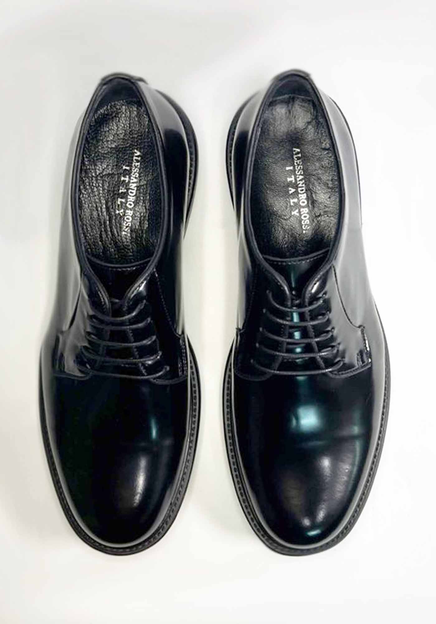 Δερμάτινα Derby Shoes της εταιρείας Alessandro Rossi. Ανήκουν στην Business συλλογή της εταιρείας και χαρακτηρίζονται από τον Minimal σχεδιασμό. Είναι ο απόλυτος συνδυασμός άνεσης με style και συνιστώνται για καθημερινή χρήση αλλά και για πιο επίσημες εμφανίσεις. Τέλος, είναι ολόμαυρα από γυαλιστερό δέρμα, ενώ η σόλα τους είναι πολύ ελαφριά για ένα μαλακό πάτημα.
