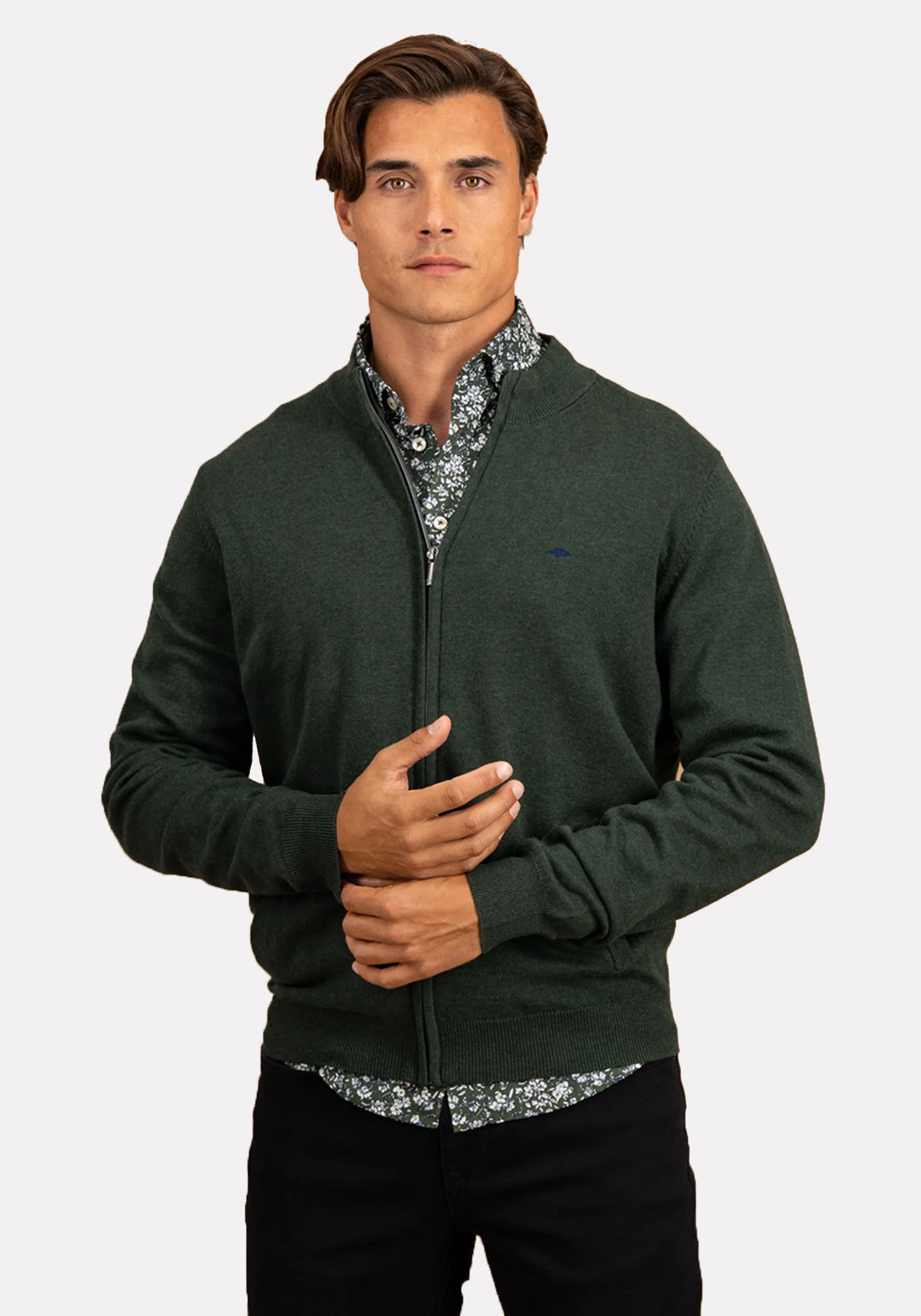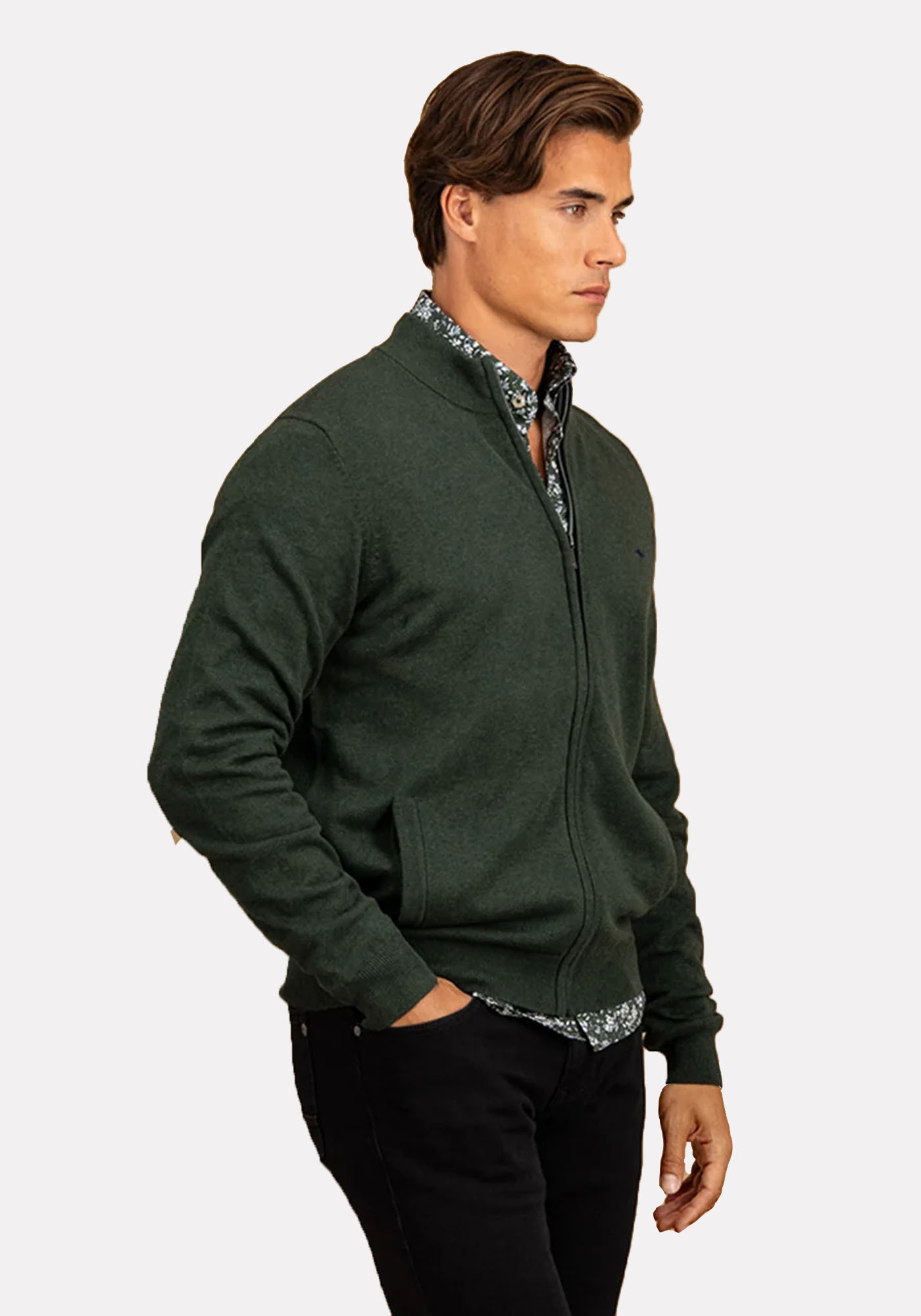 Aνδρικό ζακέτα της εταιρείας Fynch Hatton. Ανήκει στην Cardigan συλλογή της εταιρείας και αποτελείται από ύφασμα υψηλής ποιότητας. Είναι μονόχρωμη με διακριτικο μικροσχέδιο στην ύφανση και σε κανονική γραμμή, ενώ το λογότυπο την διακοσμεί στο ύψος του στήθους. Τέλος, διαθέτει full zip, δύο τσέπες στο πλάι και λάστιχο στα μανίκια και στην μέση για σταθερό κράτημα.