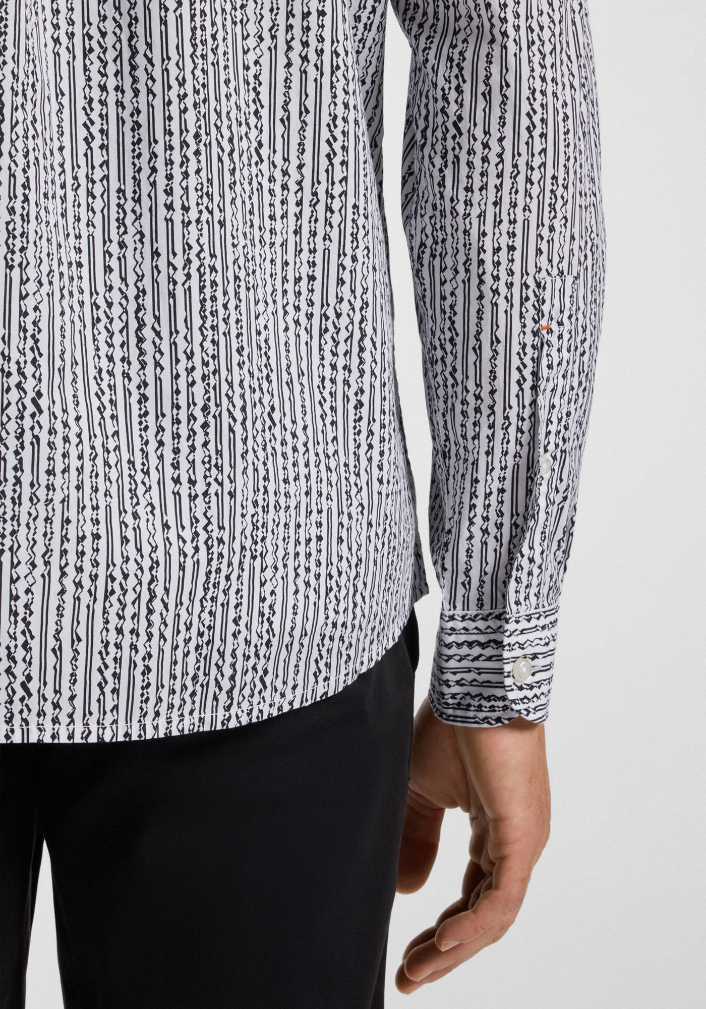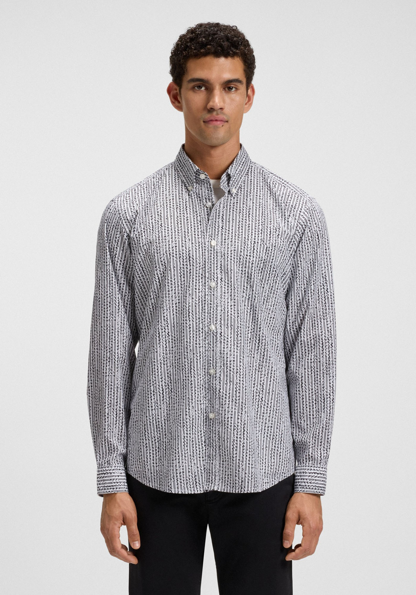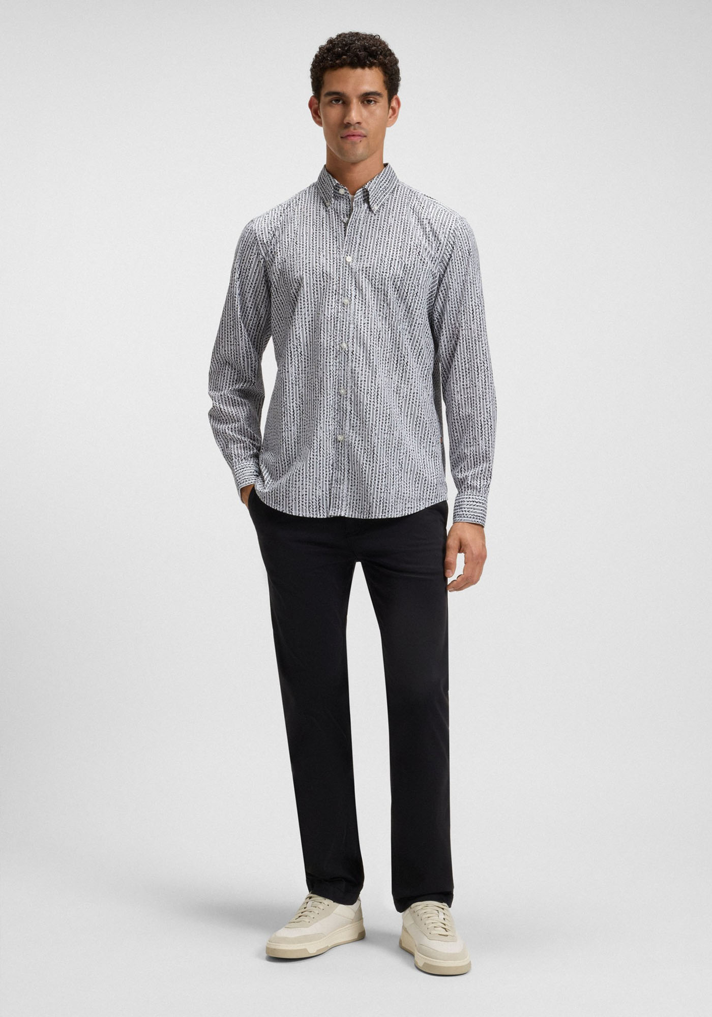 Ανδρικό πουκάμισο της εταιρείας BOSS. Ανήκει στην Rickert M συλλογή της εταιρείας, και έχει σαν χαρακτηριστικό τον άψογο σχεδιασμό, ενώ διασκοσμείται print σε επαναλαμβανόμενο μοτίβο. Είναι σε Regular γραμμή, από ύφασμα υψηλής ποιότητας και αγκαλίαζει άψογα το κορμί.