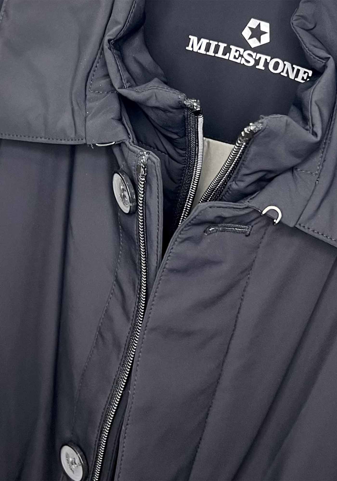 Ανδρικό αδιάβροχο μπουφάν από την εταιρεία Milestone. Ανήκει στην MS Manhattan συλλογή της εταιρείας και χαρακτηρίζεται από την αποσπώμενη επένδυση στο μπροστά μέρος που κρατάει ζεστό το σώμα. Είναι μονόχρωμο και σε regular γραμμή και διαθέτει δύο πλαϊνες τσέπες, ενώ τέλος το φερμουάρ εχαρακτηρίζεται ως full zip λόγω της έκτασης του.