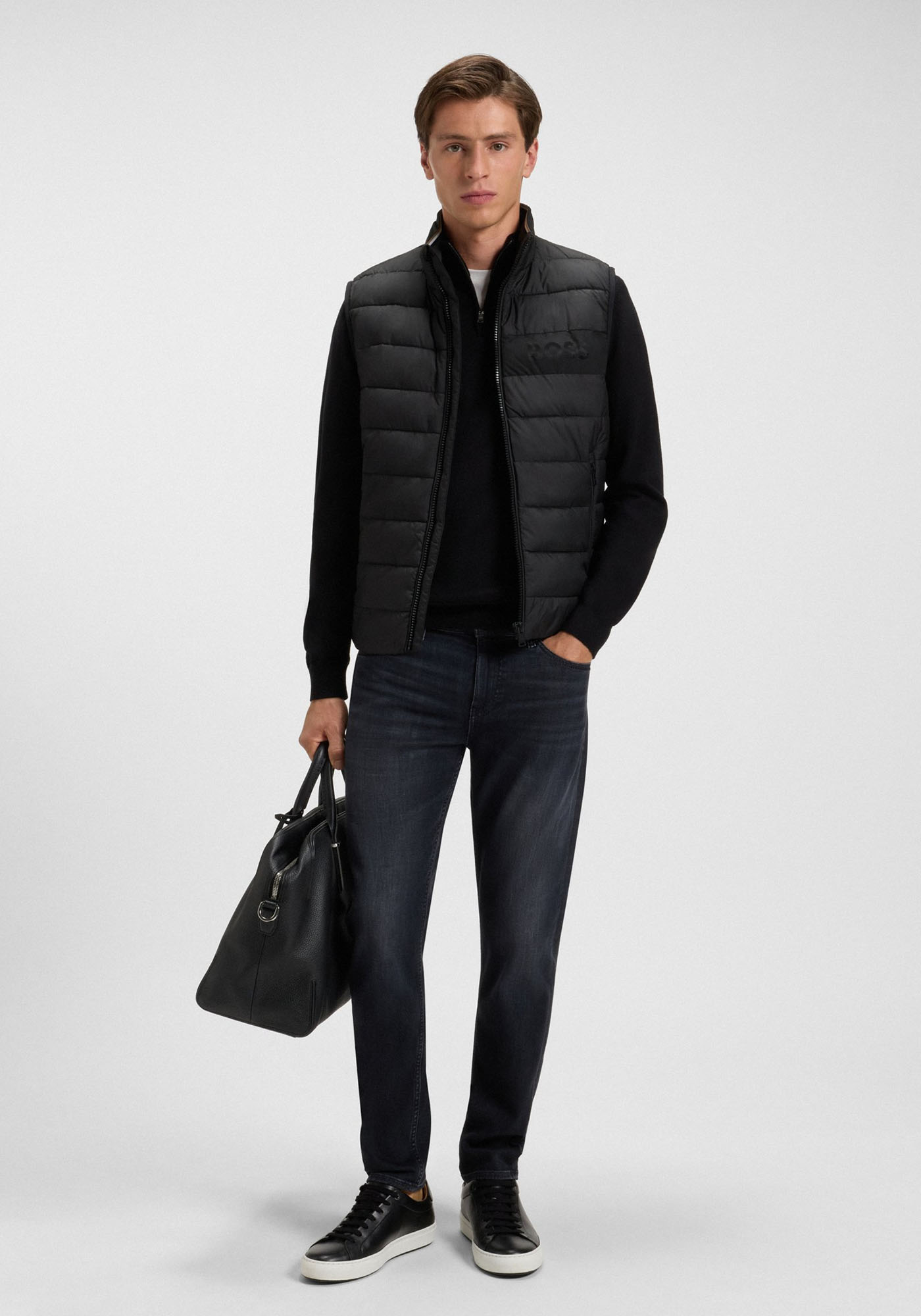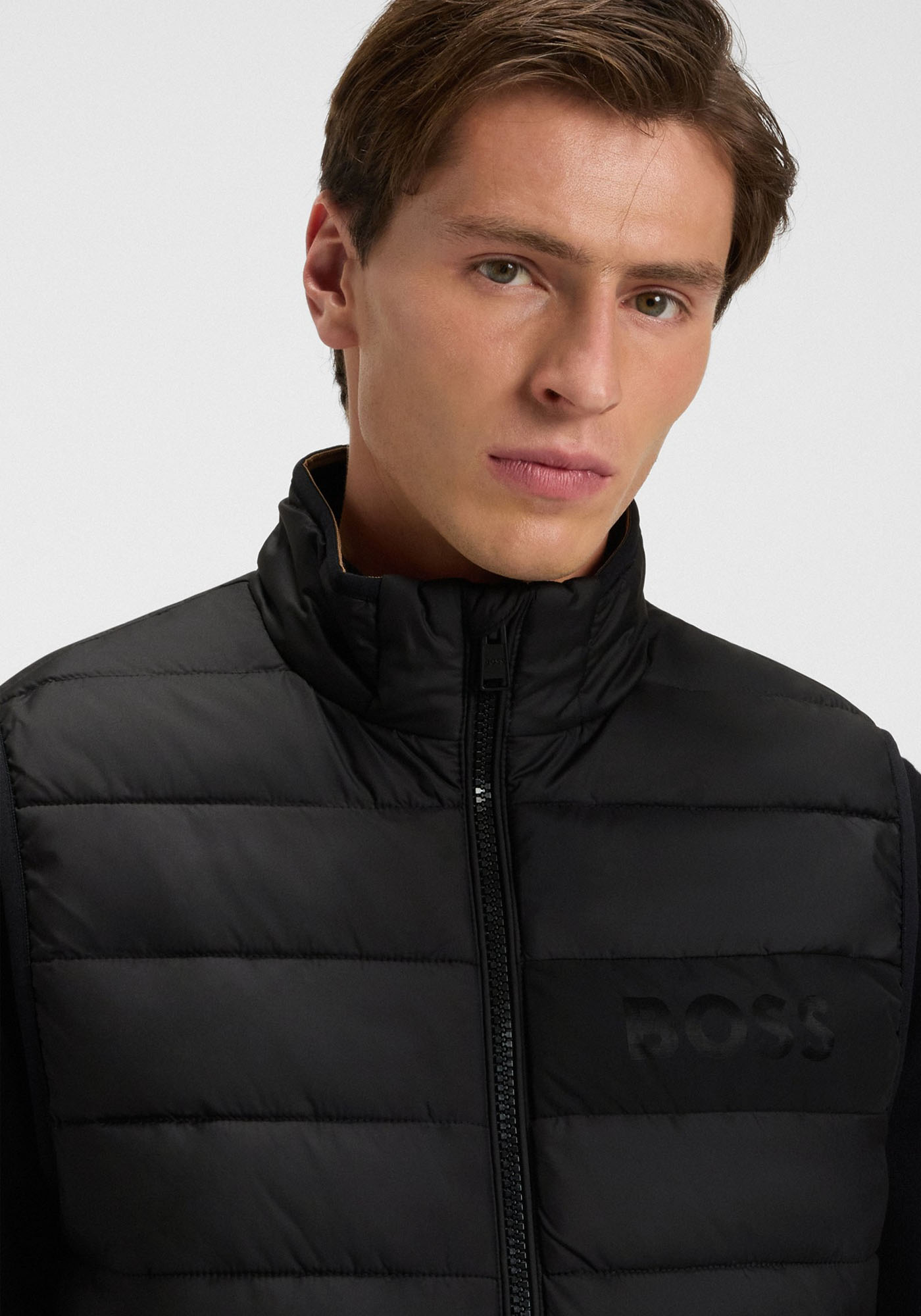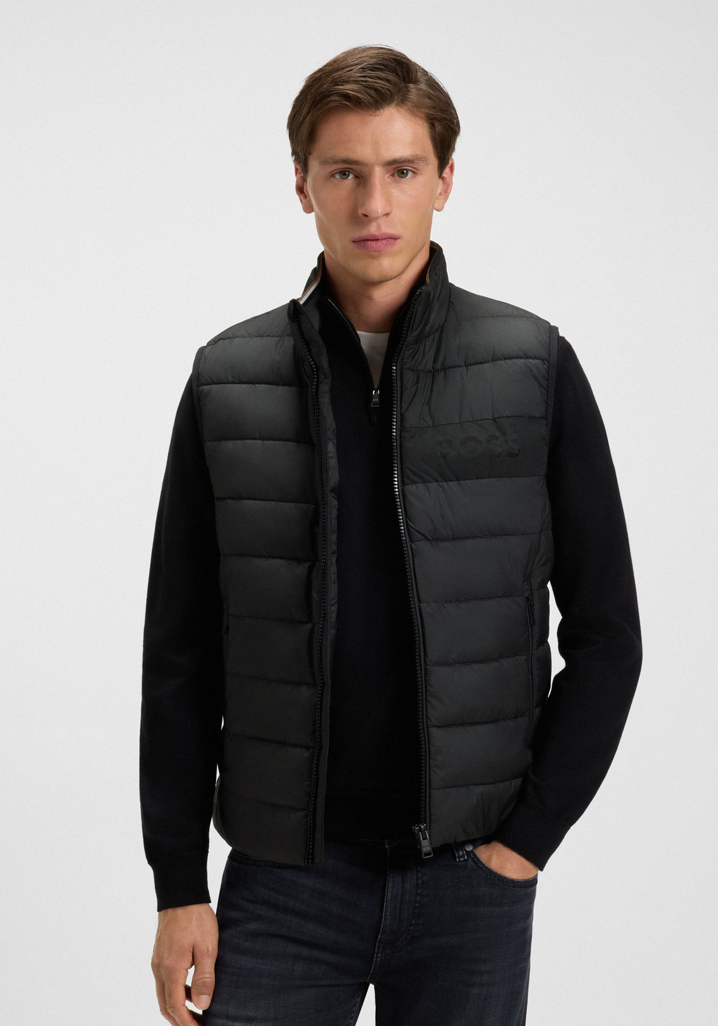 Ανδρικό Αμάνικο μπουφάν από την εταιρεία BOSS. Ανήκει στην Cenito συλλογή της εταιρείας και κρατάει ζεστό το σώμα. Είναι μονόχρωμο με το brandname να το διακοσμεί στο ύψος του στήθους. Διαθέτει δύο πλαϊνες τσέπες που κλείνουν με φερμουάρ, τέλος το φερμουάρ εχαρακτηρίζεται ως full zip λόγω της έκτασης του.