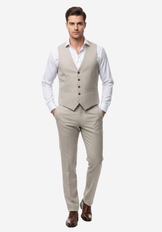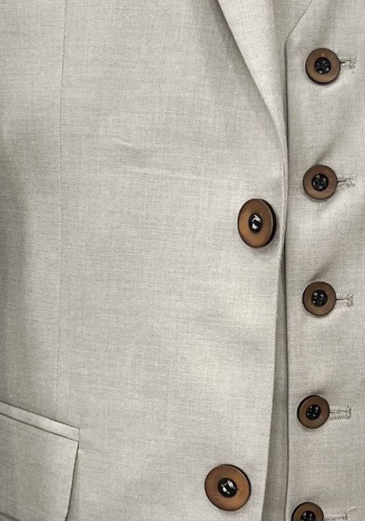 Το γιλέκο είναι και αυτό σε στενή γραμμή και αγκαλιάζει το σώμα τονίζοντας τον κορμό και διαθέτει κουμπιά για κλείσιμο.