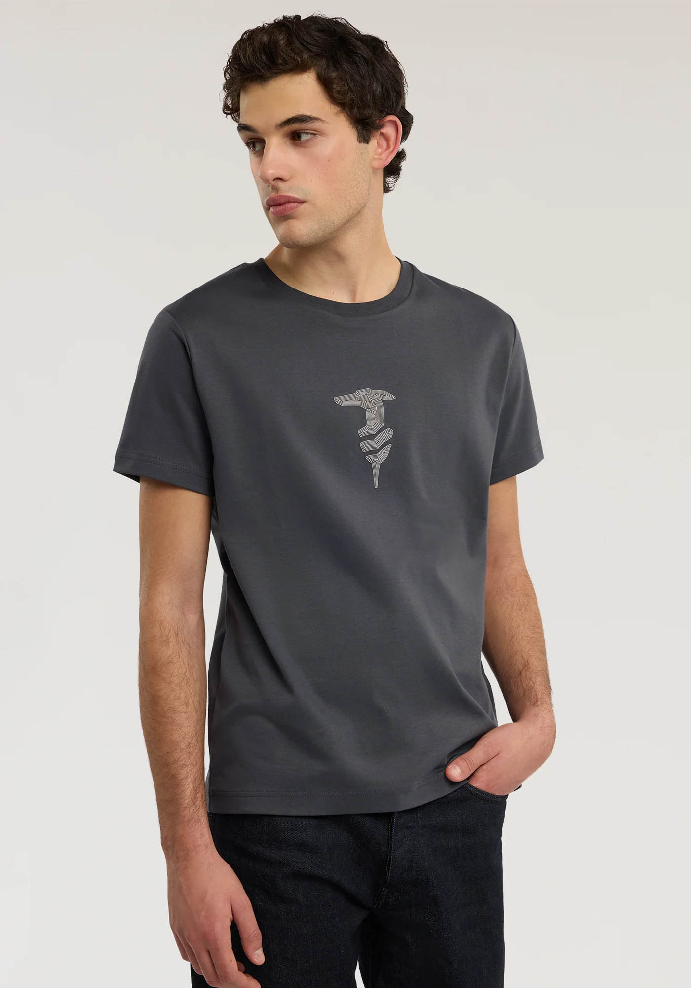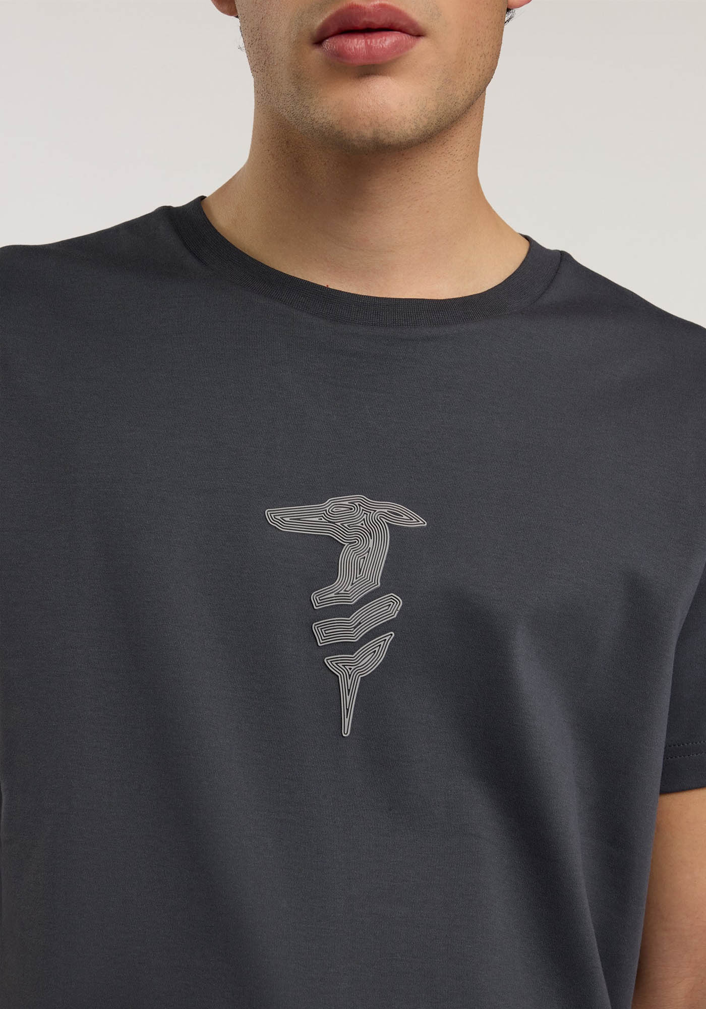 Ανδρικό T Shirt της εταιρείας Trussardi Jeans. Ανήκει στην Print συλλογή της εταιρείας και χαρακτηρίζεται από το 3D λογότυπο στο ύψος του στήθος. Τέλος, είναι από Mercerised ύφασμα υψηλής ποιότητας, μονόχρωμο με ribbed λεπτομέρεια στον γιακά.