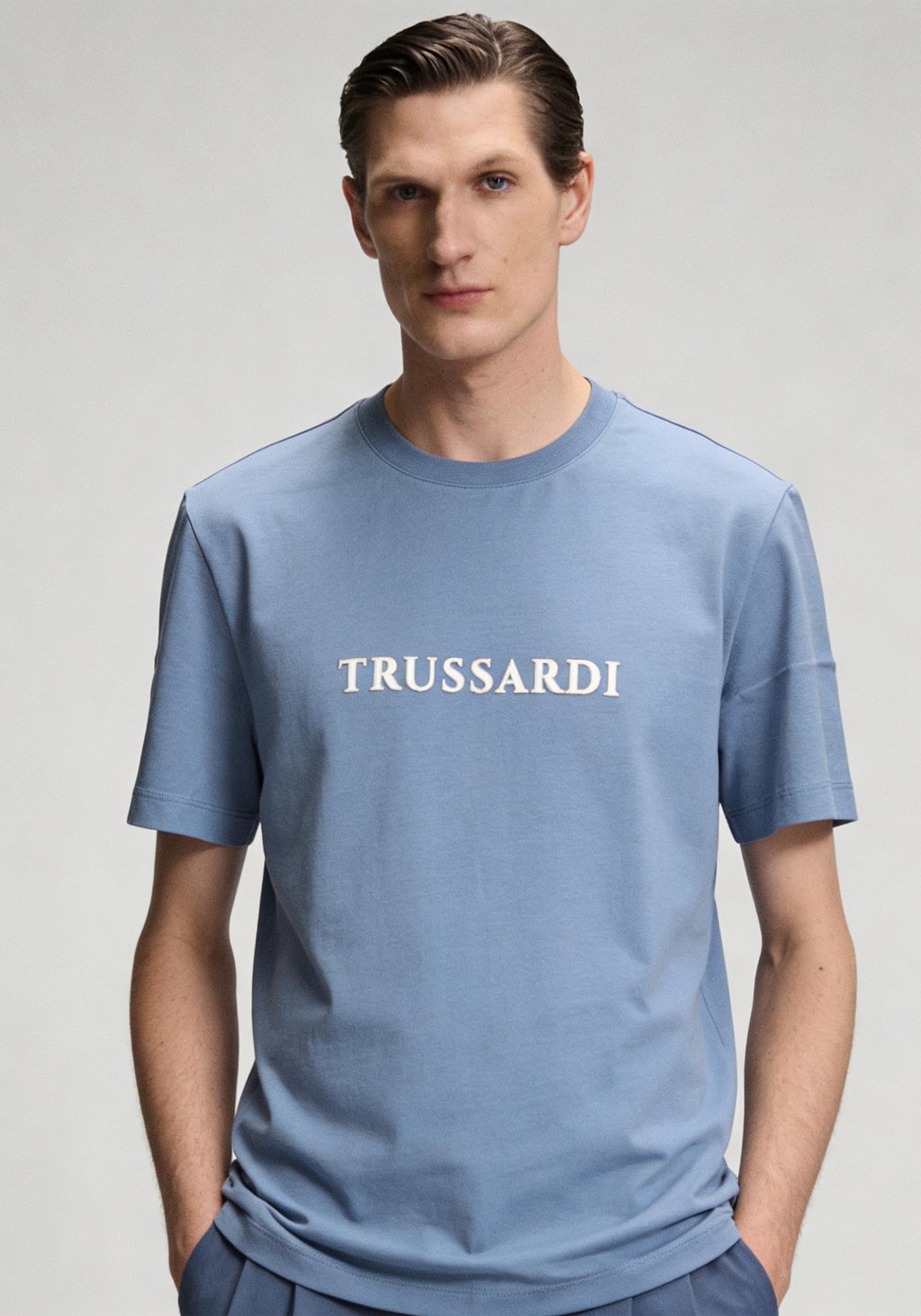 Ανδρικό T Shirt της εταιρείας Trussardi Jeans. Ανήκει στην Print συλλογή της εταιρείας και χαρακτηρίζεται από το λογότυπο στο ύψος του στήθος. Τέλος, είναι από ύφασμα υψηλής ποιότητας, μονόχρωμο με ribbed λεπτομέρεια στον γιακά.