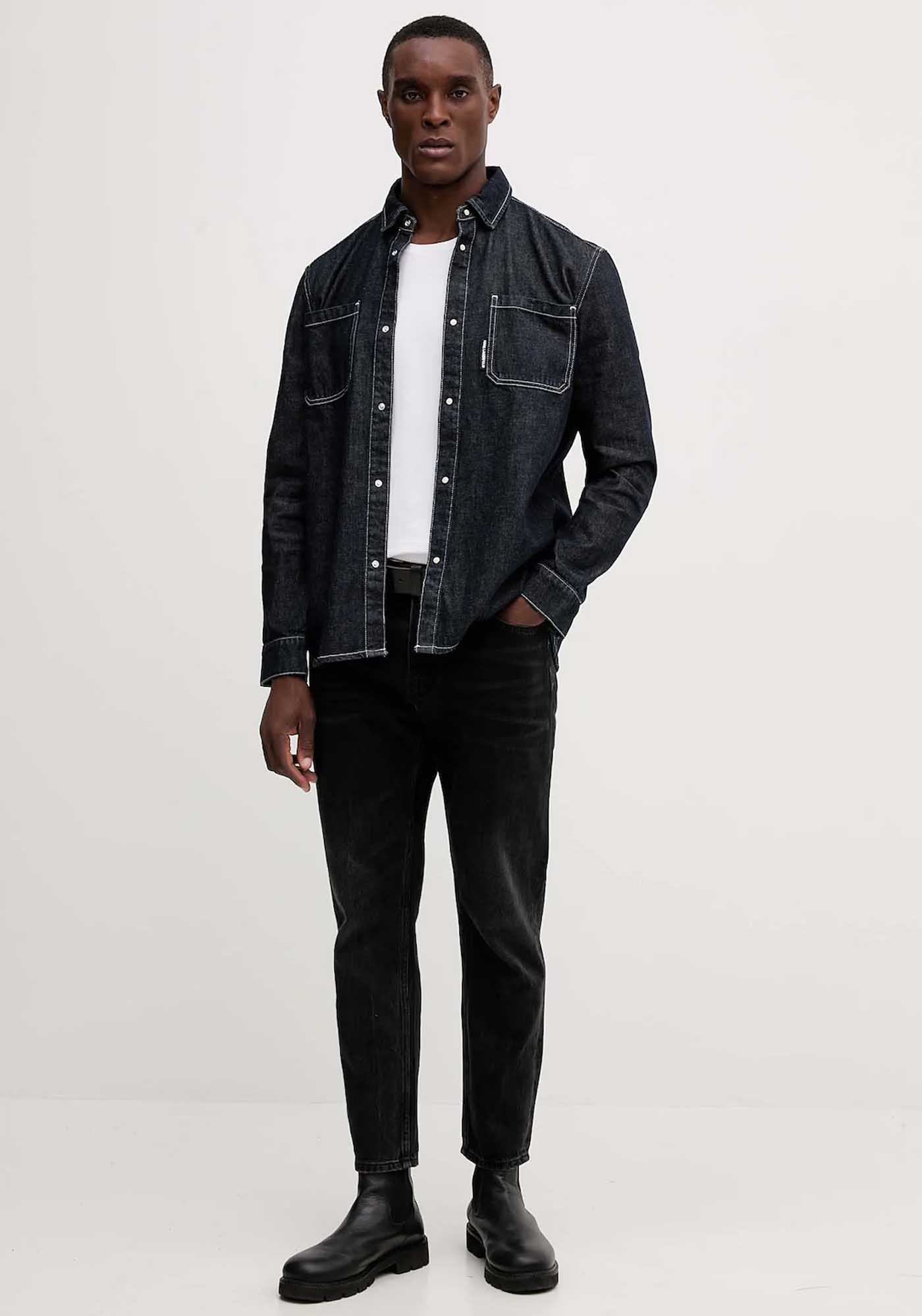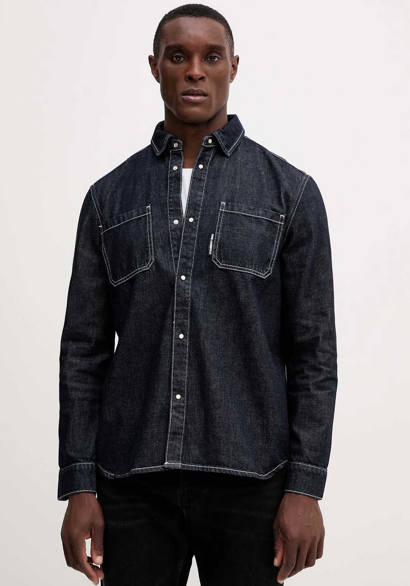 Aνδρικό Denim Πουκάμισο της εταιρείας Karl Lagerfeld. Ανήκει στην Denim συλλογή της εταιρείας και αποτελείται από μαλακό ύφασμα υψηλής ποιότητας. Είναι μονόχρωμο και σε κανονική γραμμή, ενώ το λογότυπο την διακοσμεί στο ύψος του στήθους πάνω στην τσέπη.