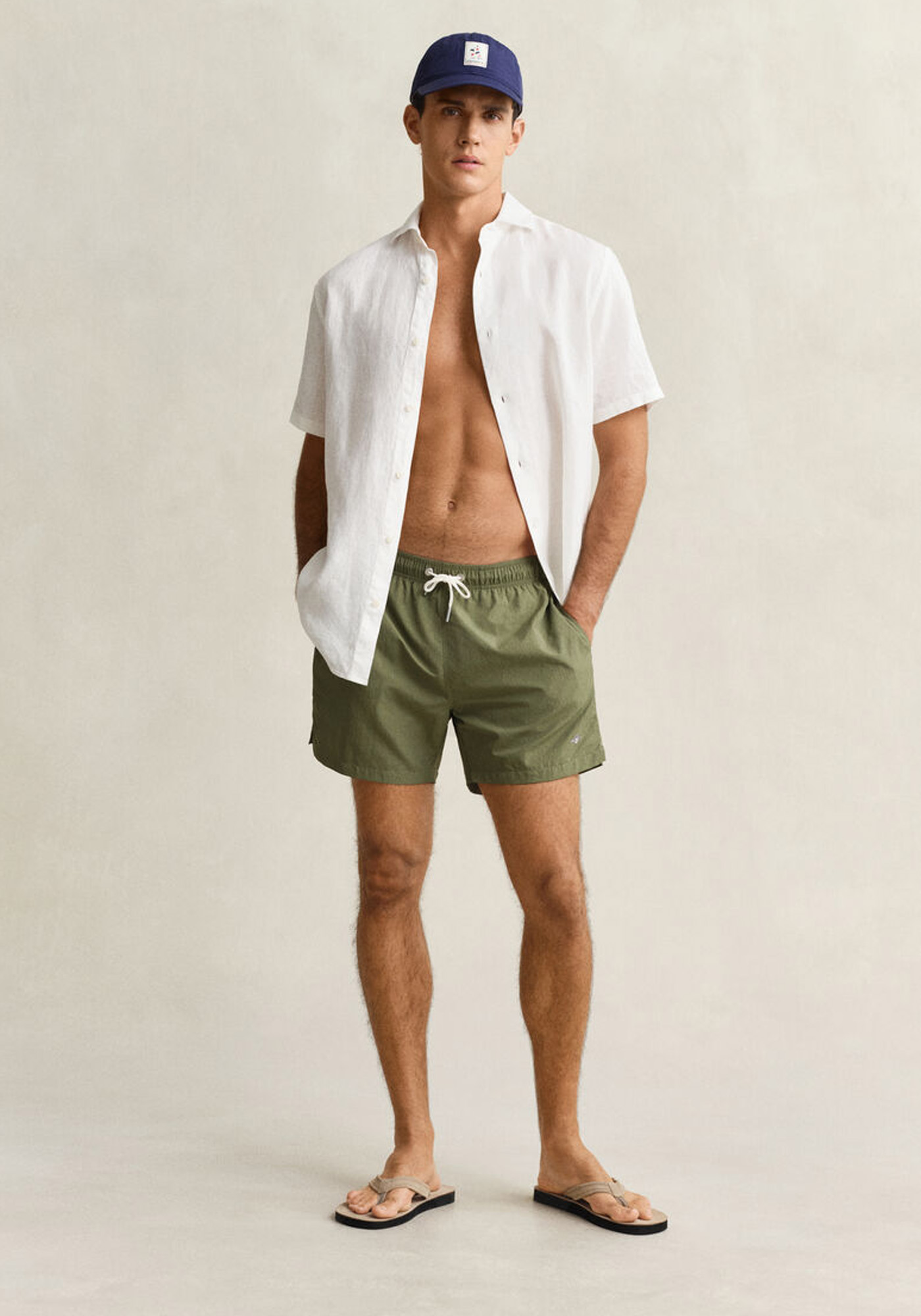 Ανδρικό μαγιό της εταιρείας GANT. Ανήκει στην Classic συλλογή και διαθέτει αδιάβροχη επίστρωση. Είναι μονόχρωμο, ενώ το λογότυπο του βρίσκεται τυπωμένο στoν μηρό. Διαθέτει λάστιχο στην μέση και κορδόνι για πιο σταθερό κράτημα.