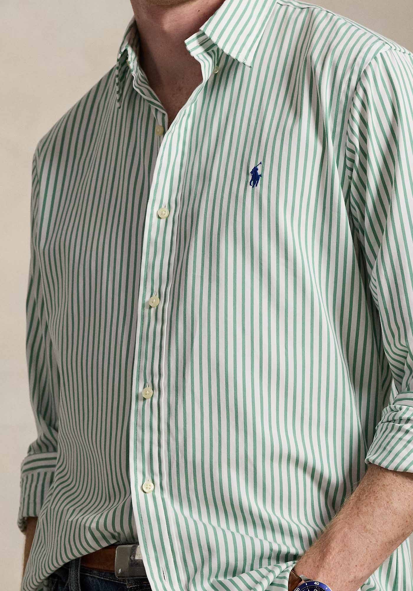 Ανδρικό μακρυμάνικο πουκάμισο από την εταιρεία Polo Ralph Lauren. Ανήκει στην Striped Stretch συλλογή της εταιρείας και χαρακτηρίζεται από το ριγέ σχέδιο σε όλη του την έκταση, που προκαλεί έντονη διχρωμία. Αποτελείται από μαλακό ύφασμα υψηλής ποιότητας και διαθέτει button down , ενώ είναι σε Custom γραμμή. Τέλος, διακοσμείται με το λογότυπο το οποίο είναι κεντημένο στο ύψος του στήθους.