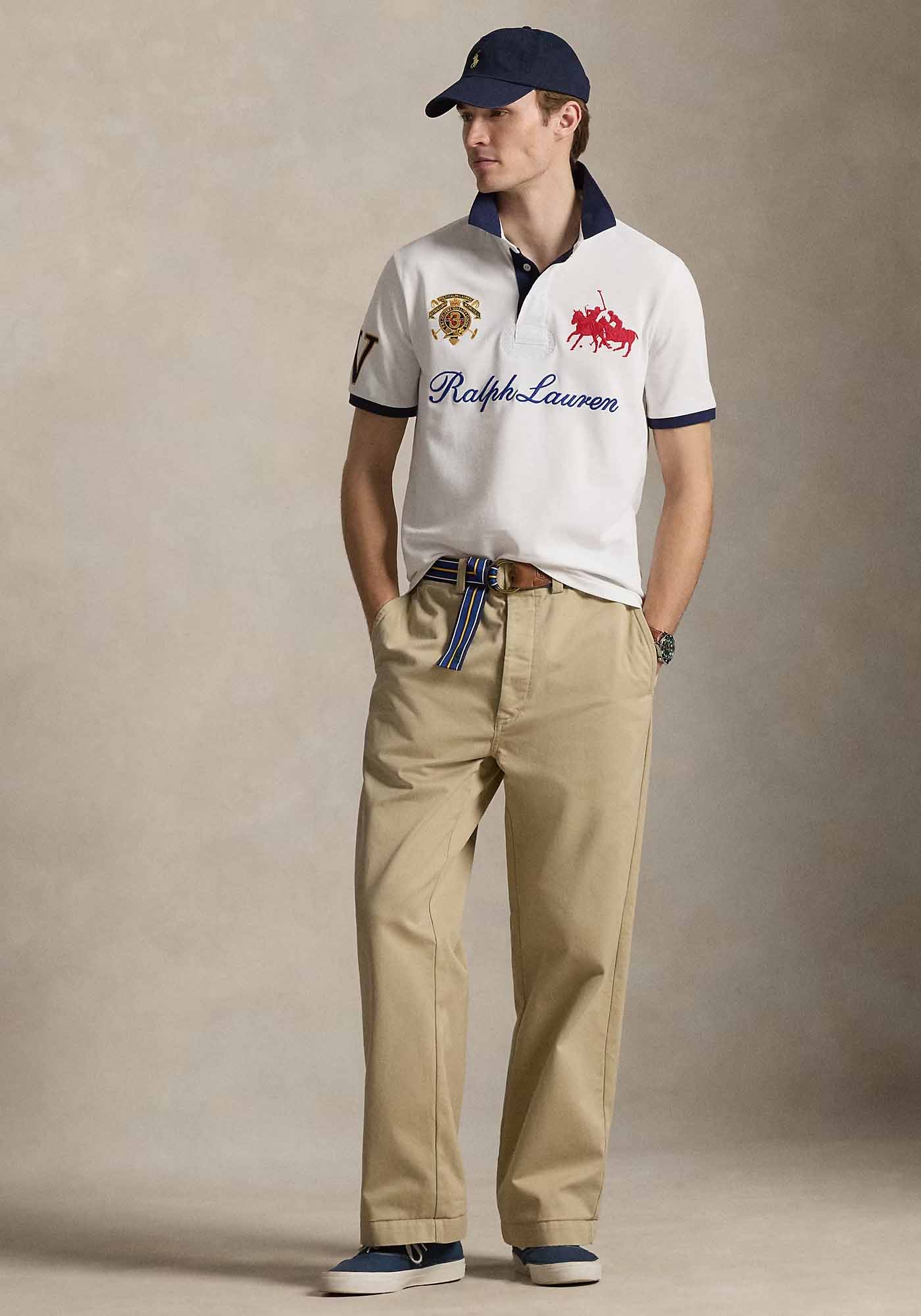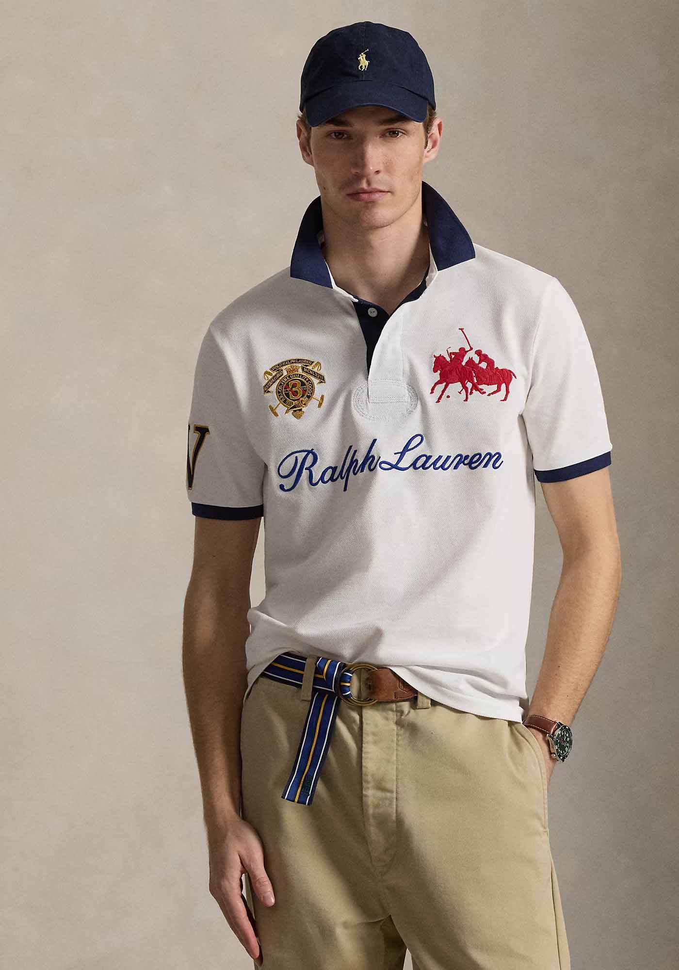 - “Polo Ralph Lauren Established MCMLXVII”, “P.R.L. Co. Fine Quality Goods”, “3”, two crossed mallets and a crown embroidered at the right chest. Script "Ralph Lauren" embroidered on the centre front.