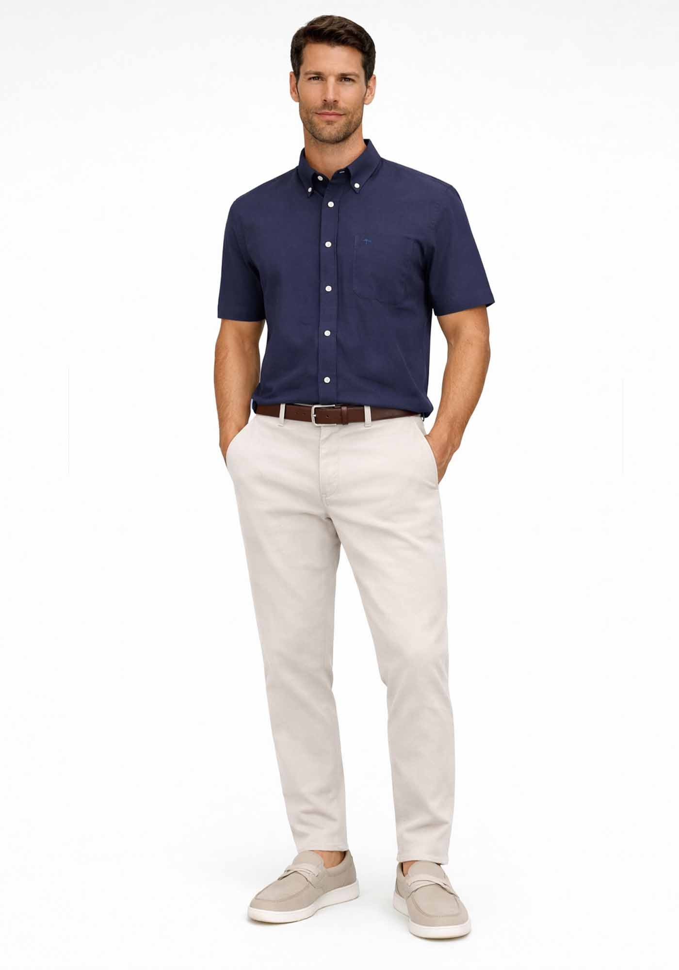 Aνδρικό Κοντομάνικο Πουκάμισο της εταιρείας Fynch Hatton. Ανήκει στην Textured συλλογή της εταιρείας και χαρακτηρίζεται από το μικροσχέδιο στην ύφανση. Είναι σε Loose γραμμή, ενώ το λογότυπο την διακοσμεί στο ύψος του στήθους πάνω στην τσέπη.