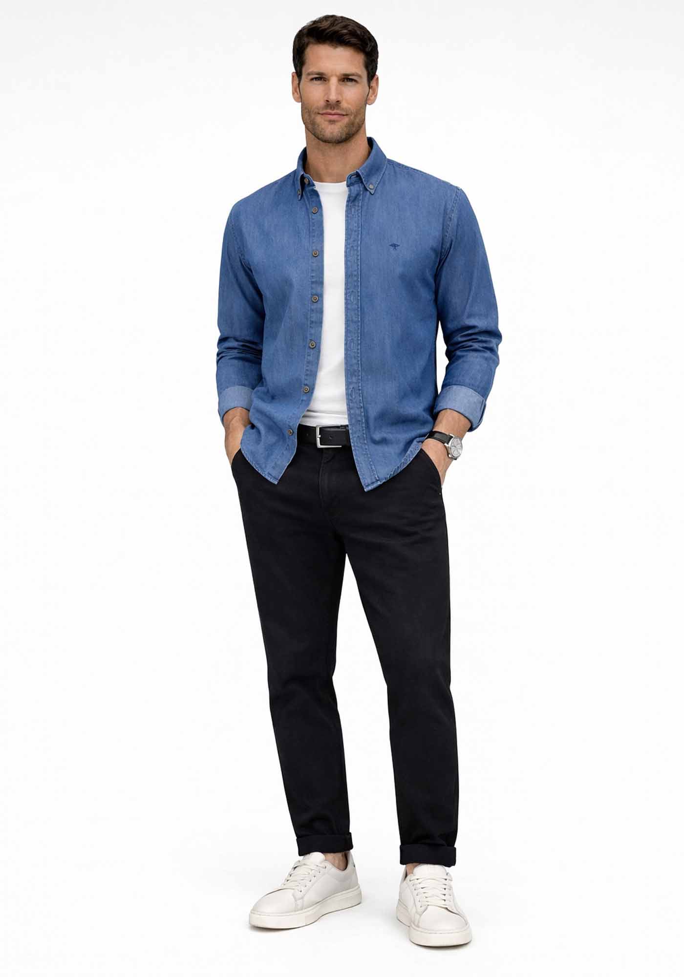 Aνδρικό Denim Πουκάμισο της εταιρείας Fynch Hatton. Ανήκει στην Denim συλλογή της εταιρείας και αποτελείται από μαλακό ύφασμα υψηλής ποιότητας. Είναι μονόχρωμο και σε κανονική γραμμή, ενώ το λογότυπο την διακοσμεί στο ύψος του στήθους πάνω στην τσέπη.