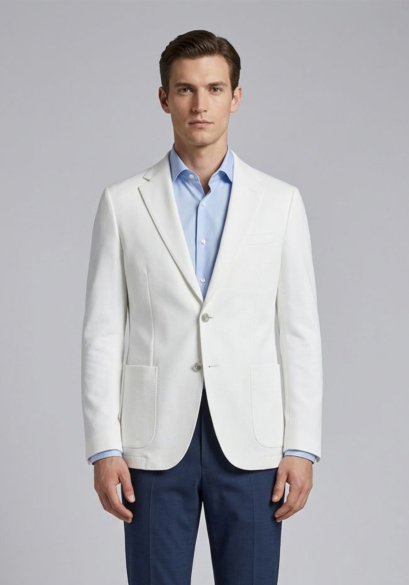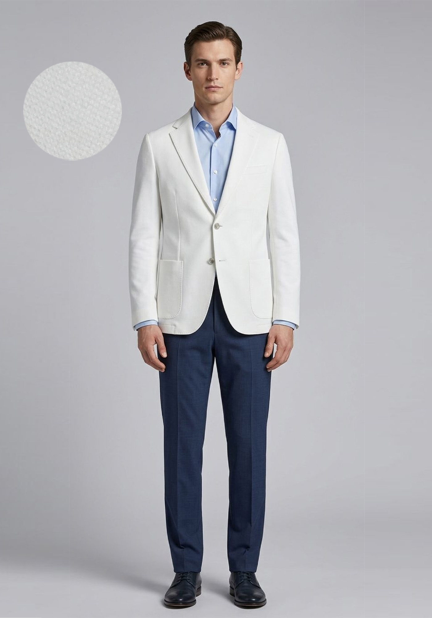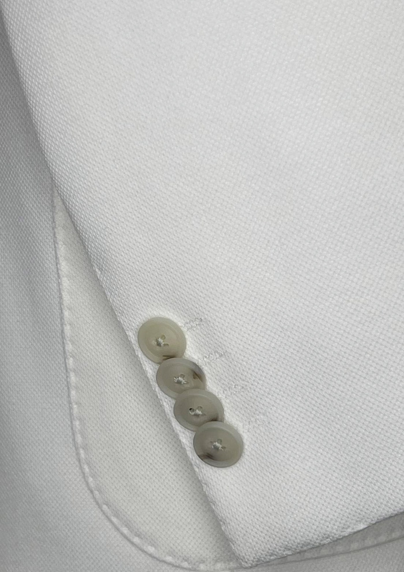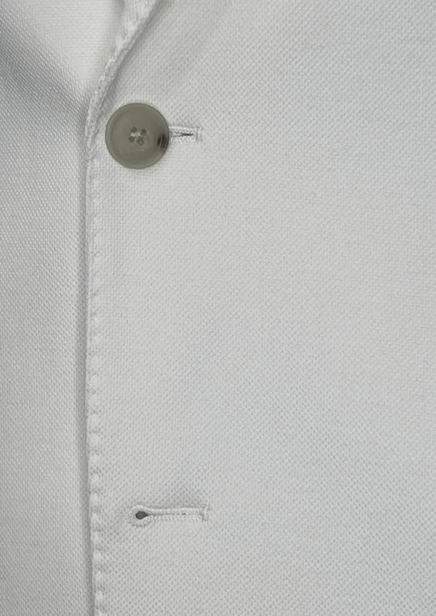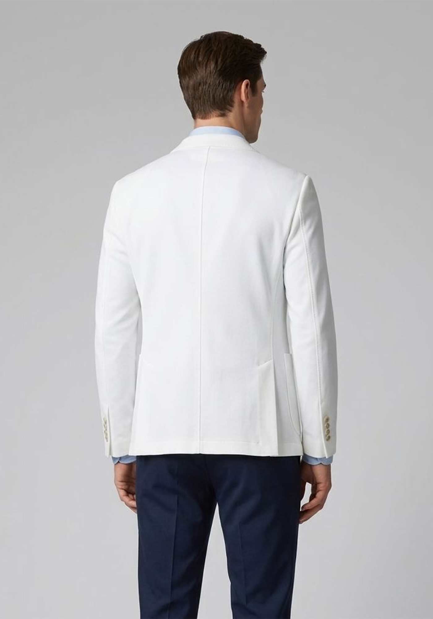 Jersey Σακάκι της εταιρείας BOSS. Είναι δίκουμπο σε εκρού απόχρωση με μικροσχέδιο στην ύφανση. Είναι μεσάτο και αγκαλιάζει το σώμα, με ελαφριες βάτες στους ώμους δίνοντας την αίσθηση της κομψότητας. Στο πίσω μέρος υπάρχουν δύο ανοίγματα που δίνουν άνεση στην κίνηση σας. Διαθέτει τσέπη στο αριστερό στήθος και δύο εξωτερικές τσέπες χωρίς καπάκι. Τέλος, είναι ιδανική επιλογή για Casual και Επίσημες εμφανίσεις.