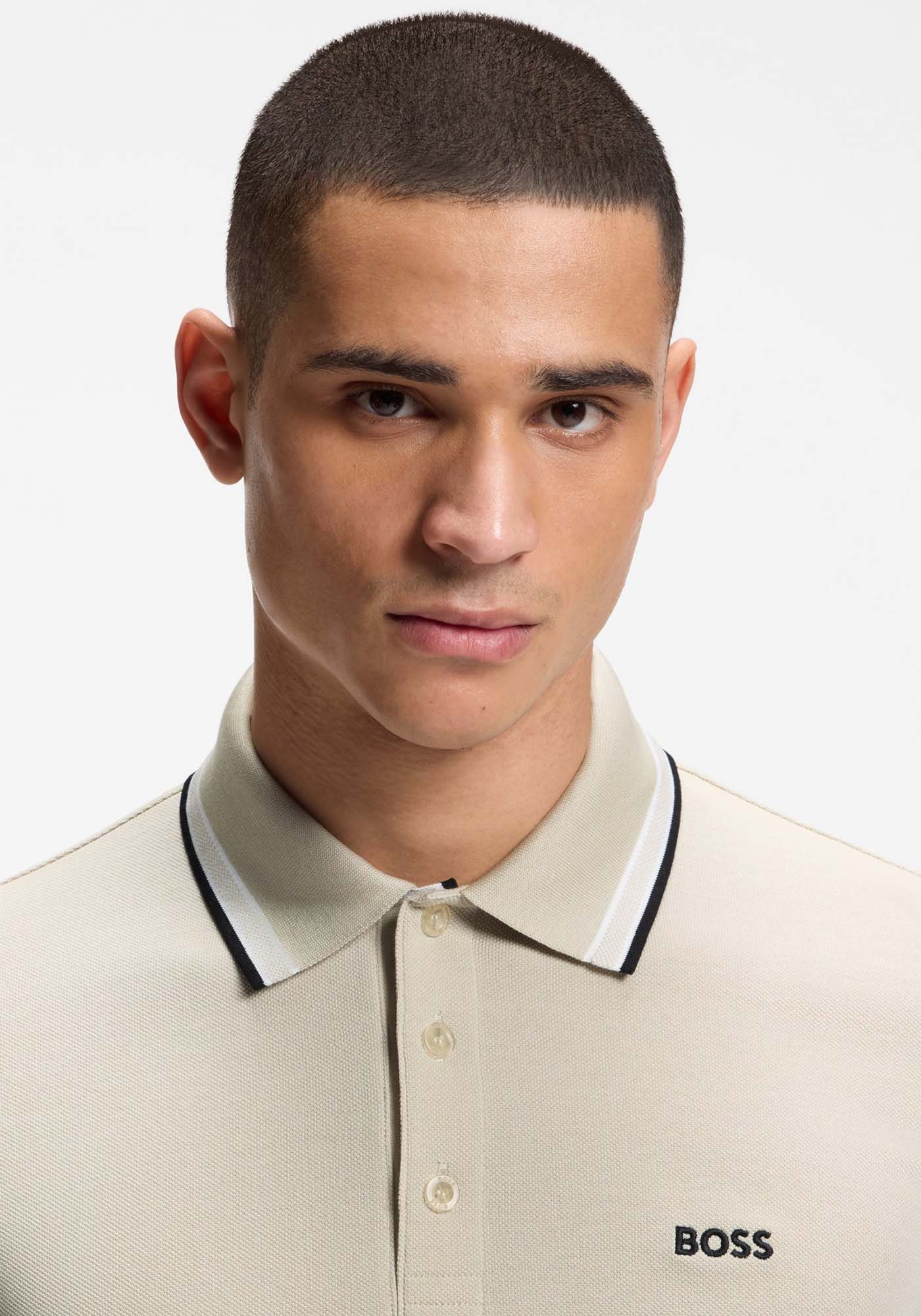 Ανδρική Polo μπλούζα της εταιρείας BOSS. Ανήκει στην Paddy συλλογή της εταιρείας και χαρακτηρίζεται από τις ribbed λεπτομέρειες στον γιακά με πολύχρωμη ρίγα. Είναι μονόχρωμη , σε Regular γραμμή, από απαλό pique ύφασμα υψηλής ποιότητας, ενώ το λογότυπο της εταιρείας είναι κεντημένο στο ύψος του στήθους.