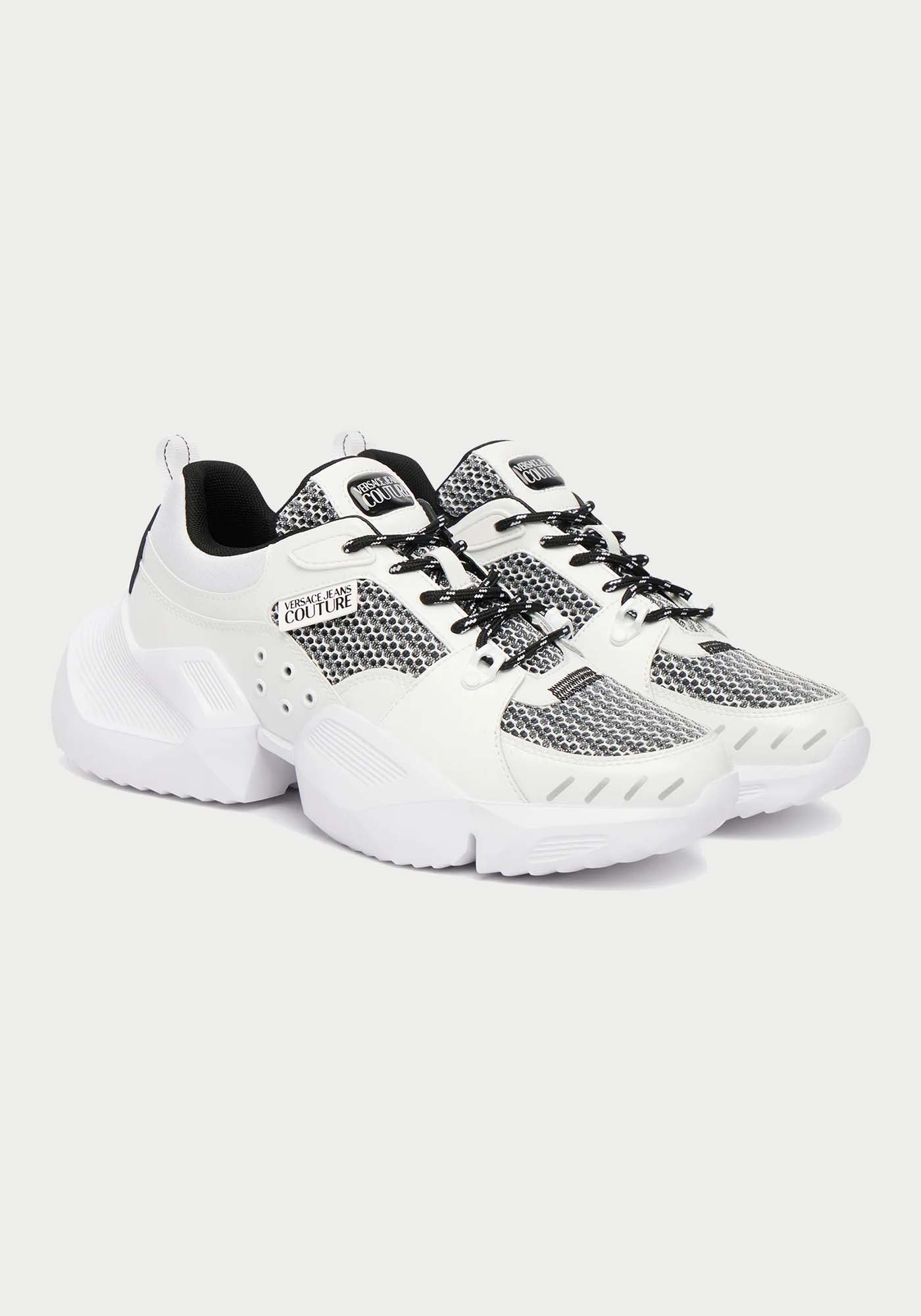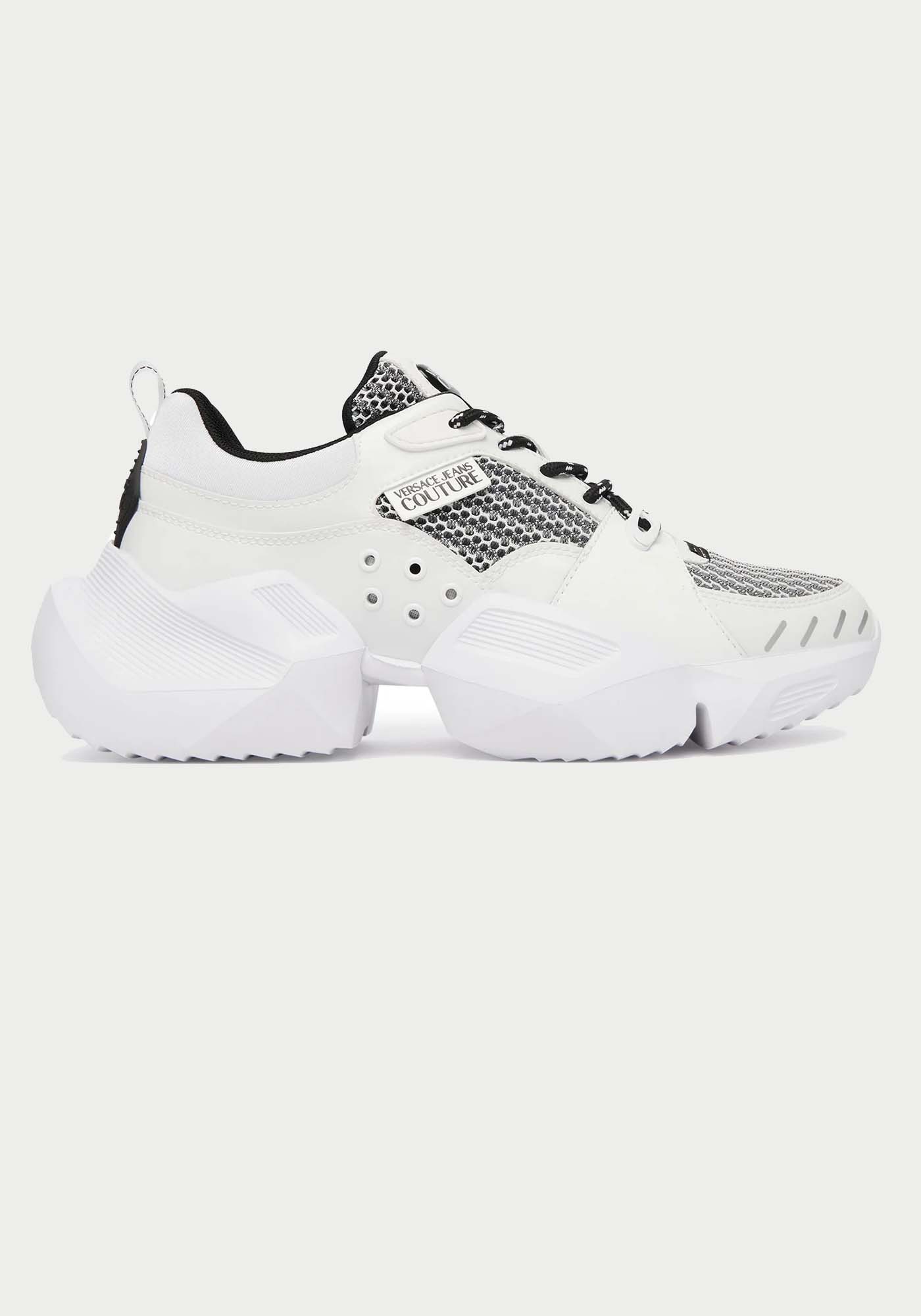 Αναβαθμίστε το street style σας με αυτά τα εντυπωσιακά sneakers της Versace Jeans Couture, που συνδυάζουν μοντέρνο design με δυναμικές λεπτομέρειες. Η αντίθεση λευκού και μαύρου, σε συνδυασμό με τα textured υλικά, δημιουργεί ένα statement αποτέλεσμα ιδανικό για καθημερινές αλλά και πιο fashion-forward εμφανίσεις.