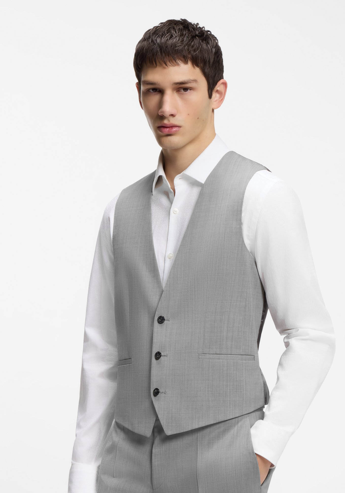 Αναβάθμισε το formal ντύσιμό σου με αυτό το κομψό κοστούμι τριών τεμαχίων από τη HUGO Menswear. Κατασκευασμένο από textured wool blend με ελαστικότητα (performance stretch), προσφέρει άνεση και άψογη εφαρμογή καθ’ όλη τη διάρκεια της ημέρας.
